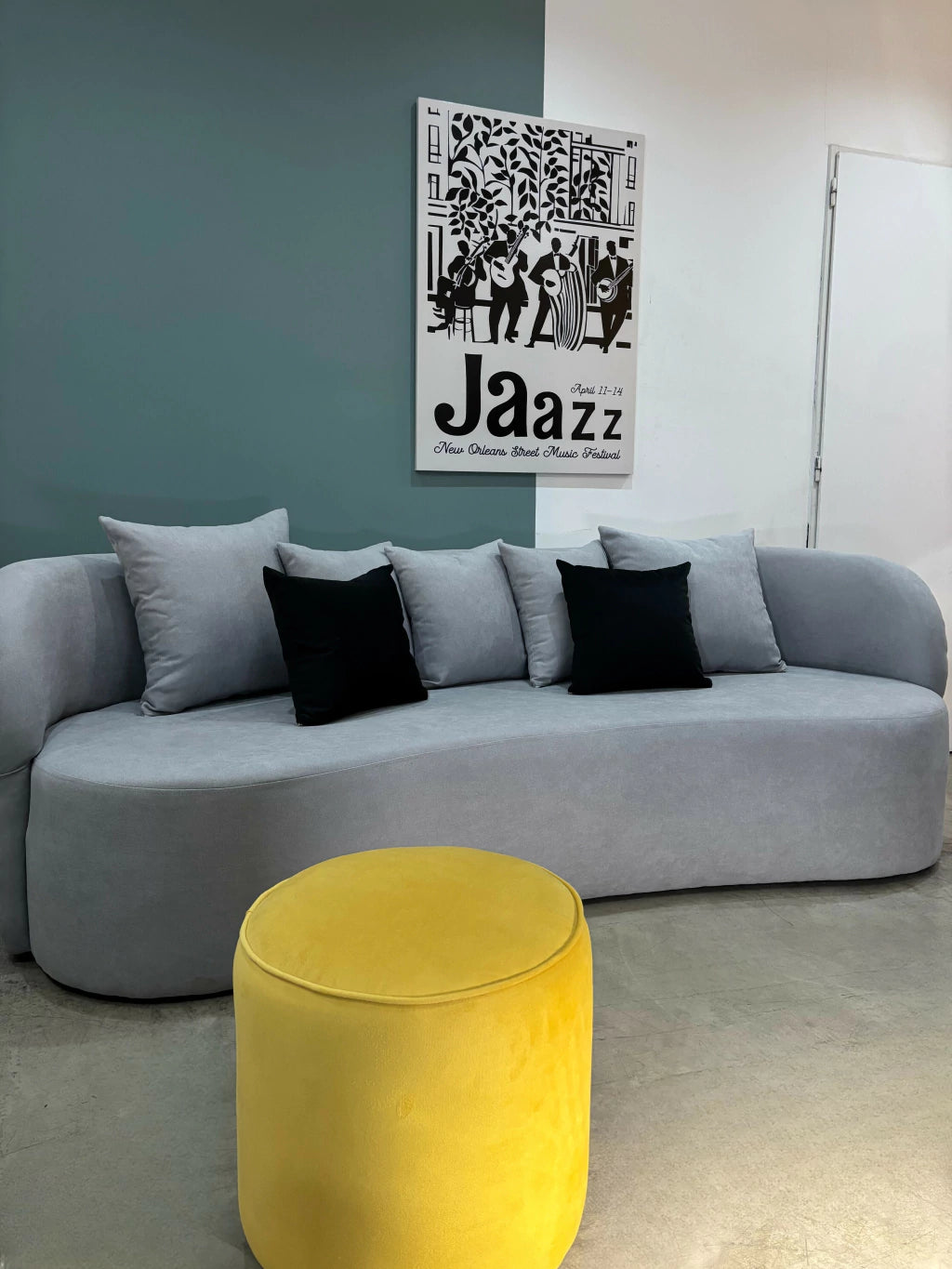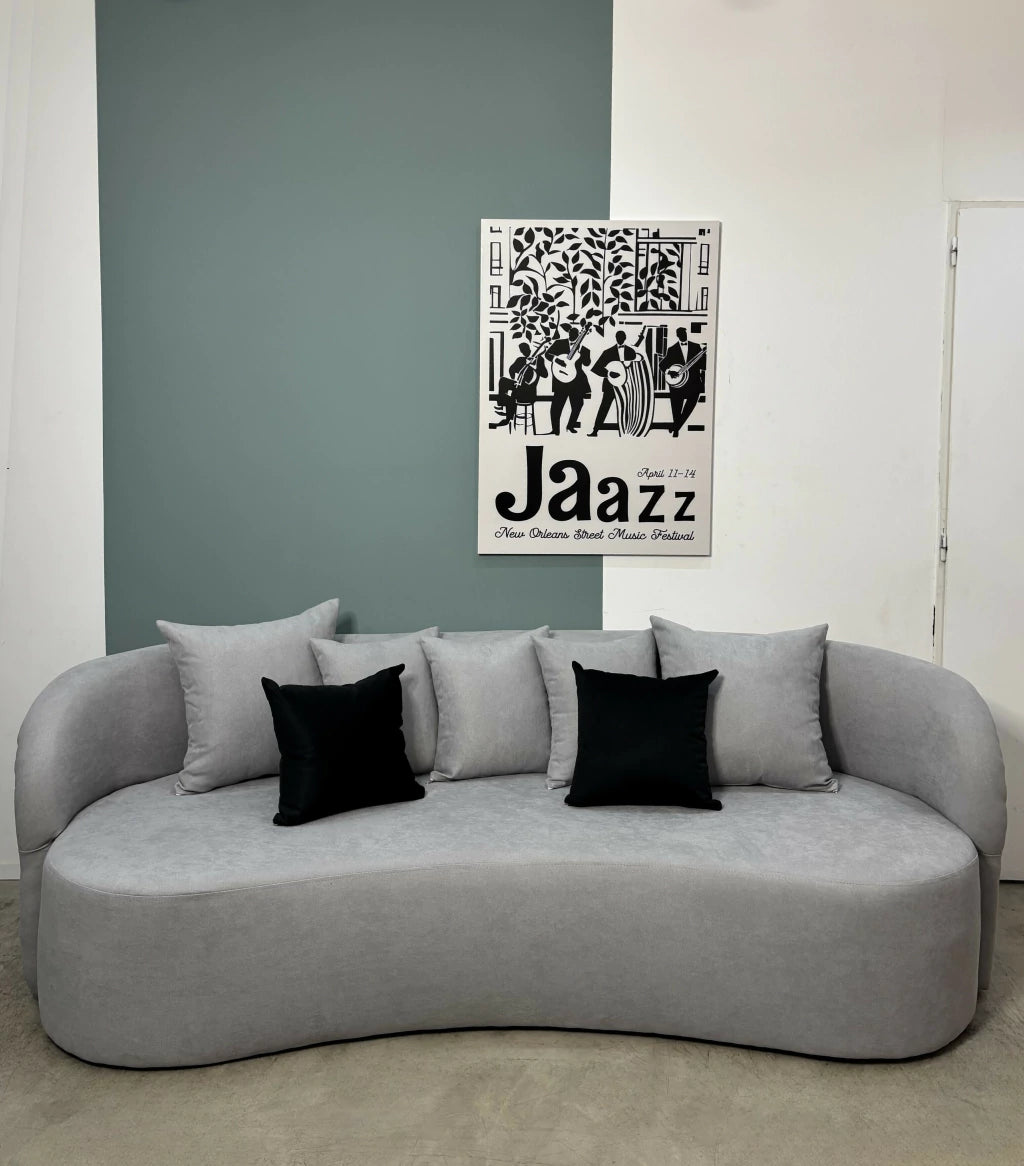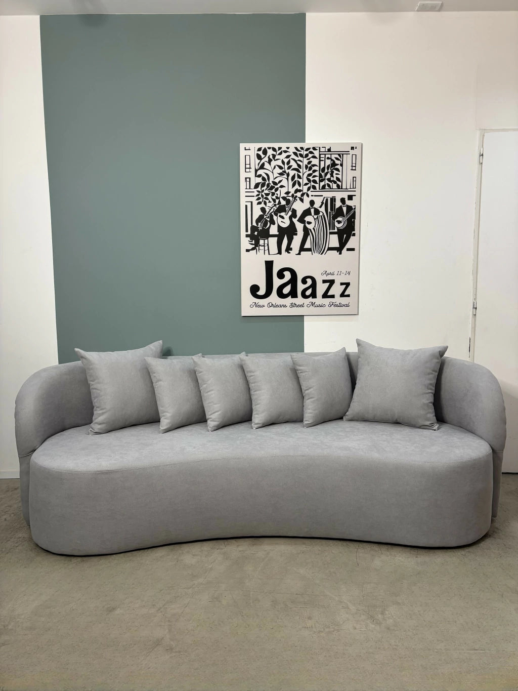 Es un sofá de 3 cuerpos con forma curva, con almohadón de asiento de placa de goma espuma de alta densidad y respaldo integrados, que le un estilo y diseño único. Tiene patas bajas de goma invisibles antideslizantes. Tapizado con tela chenille de pelo corto anti desgarro o pana anti manchas.