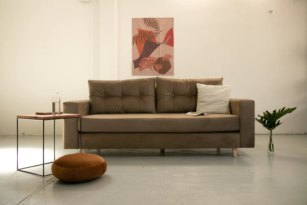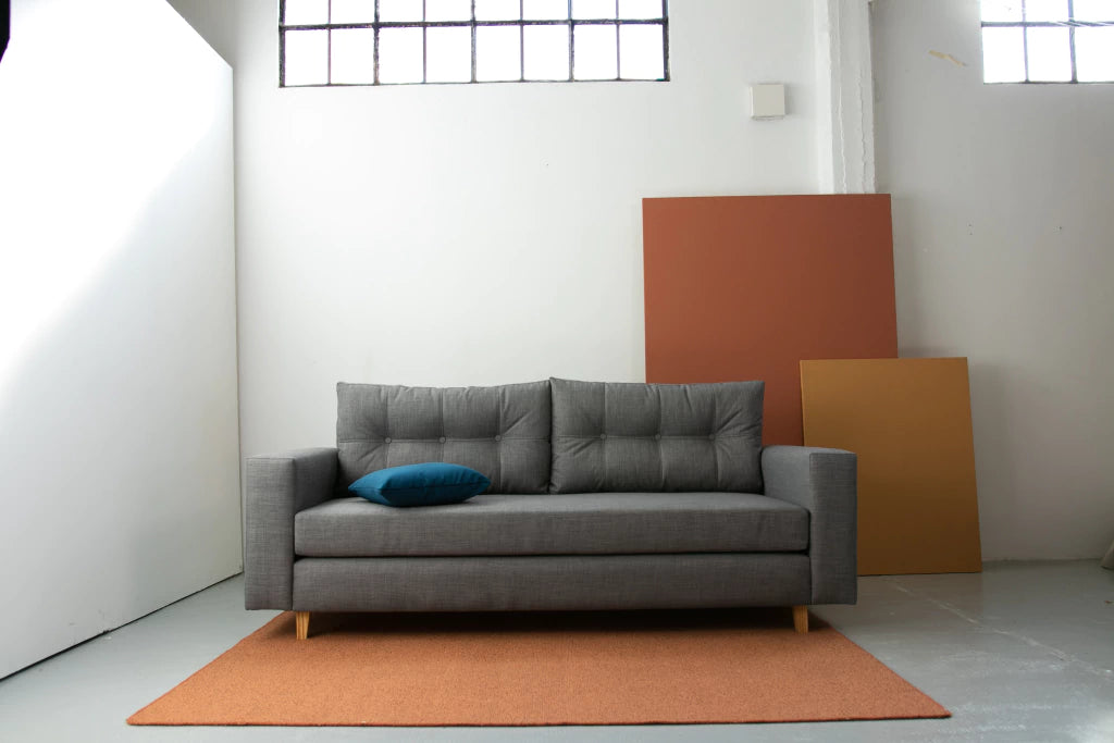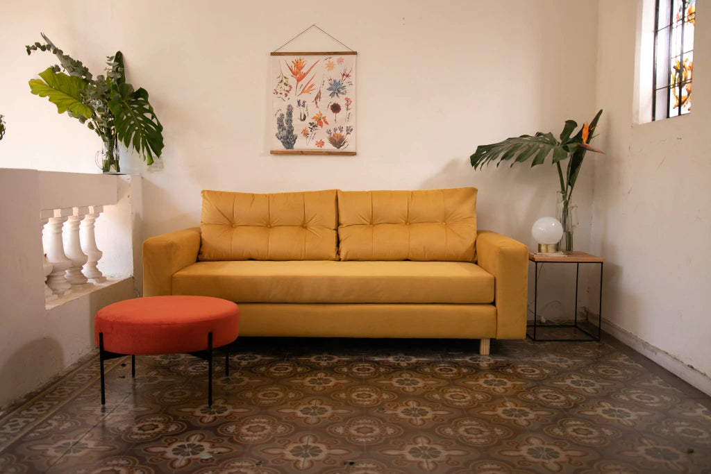 Es un sofá de 2 cuerpos con forma curva, con almohadón de asiento de placa de goma espuma de alta densidad y respaldo integrados, que le un estilo y diseño único. Tiene patas bajas de goma invisibles antideslizantes. Tapizado con tela chenille de pelo corto anti desgarro o pana anti manchas.