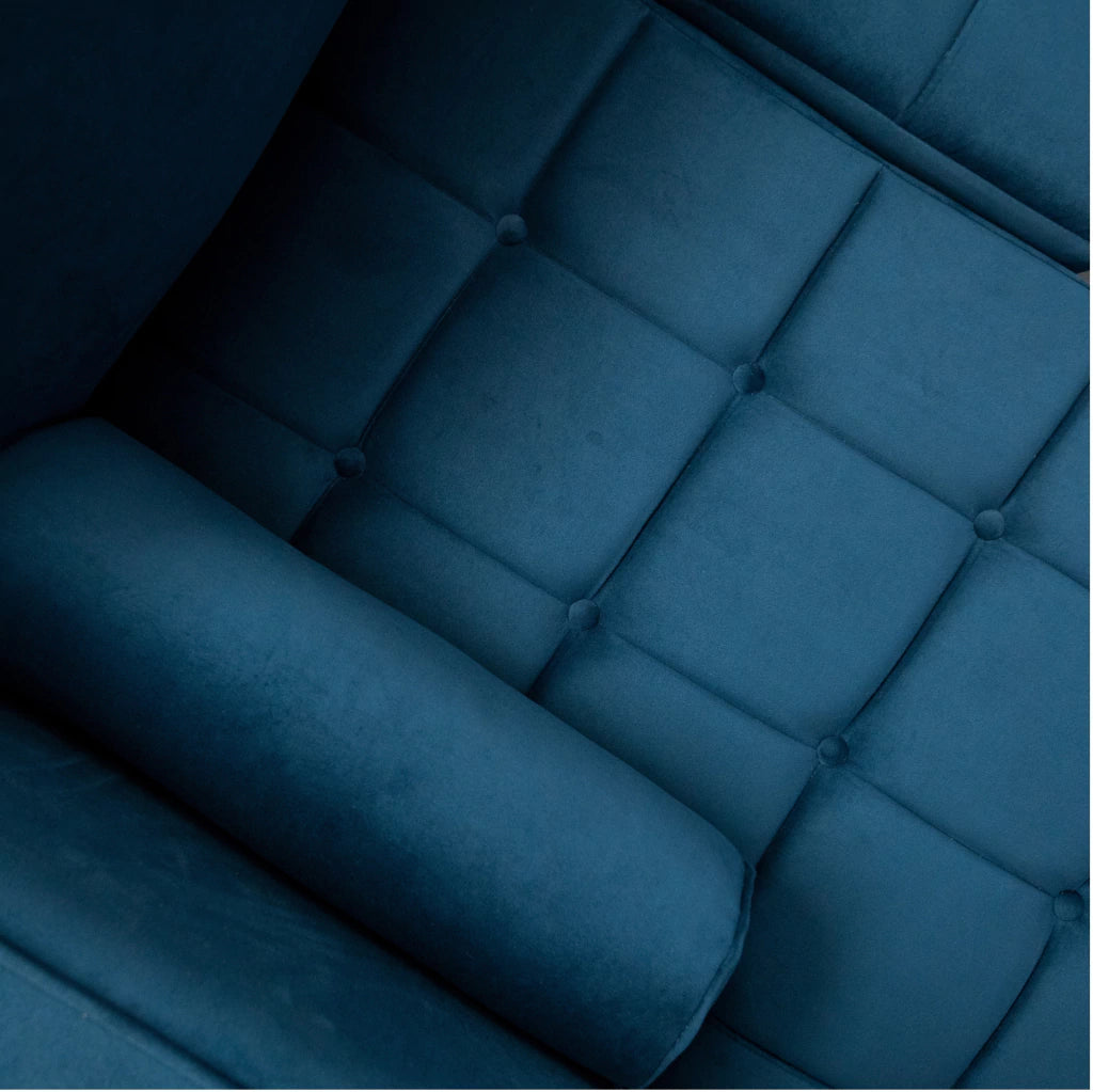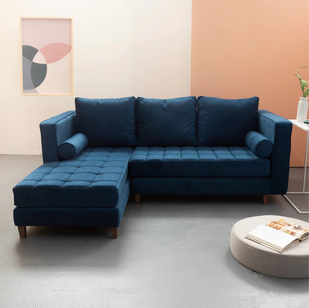 Es un sofá de 3 cuerpos, con 1 almohadón de asiento de placa de goma espuma de alta densidad con un trabajo artesanal de capitoné que le brinda un estilo y diseño único. Tiene 2 almohadones de respaldo rellenos de vellón siliconado. Tiene un esquinero fijo derecho o izquierdo y tiene patas bajas de goma invisibles antideslizantes o patas altas de madera. Tapizado con tela chenille de pelo corto anti desgarro o pana anti manchas. Consultar por la opción patas metálicas.