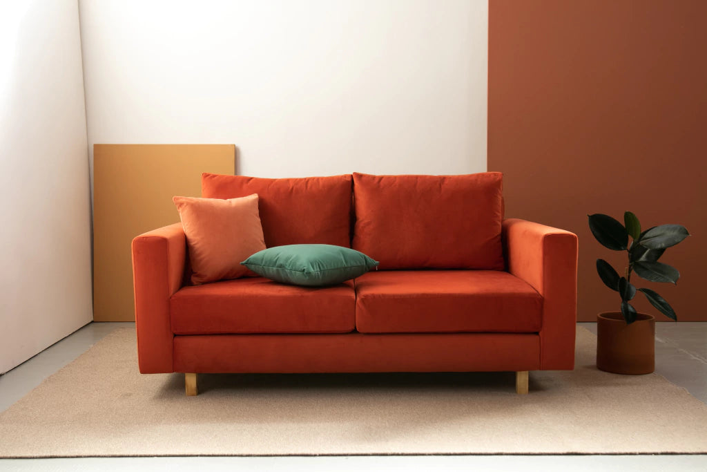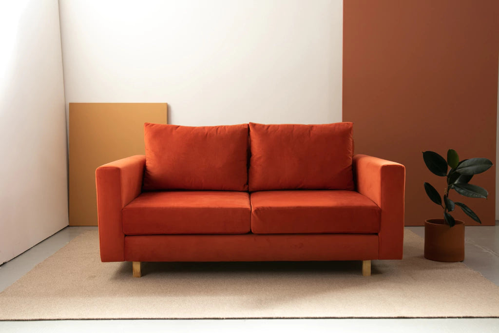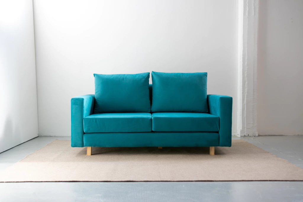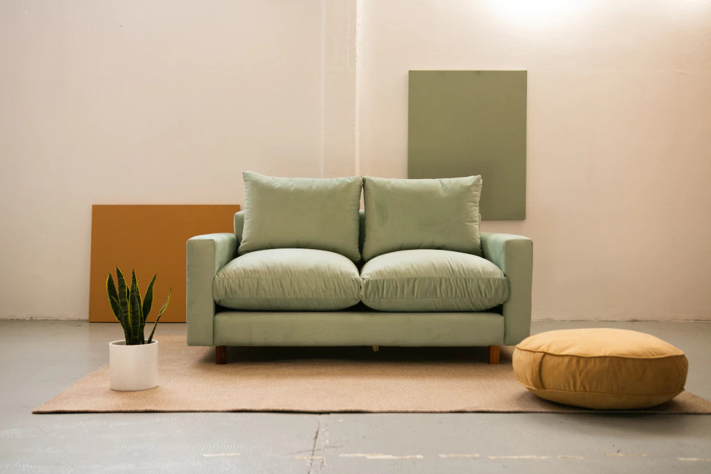 Es un sofá de 2 cuerpos, con 2 almohadones de asiento de placa de goma espuma de alta densidad y 2 almohadones de respaldo rellenos de vellón siliconado. Tiene patas bajas de goma invisibles antideslizantes o patas altas de madera. Tapizado con tela chenille de pelo corto anti desgarro o pana anti manchas. Consultar por la opción patas metálicas.