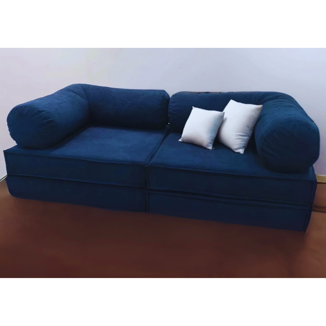 Es un sofá cama con doble placa de asiento de alta densidad de 25 kg soft, con almohadones de respaldo en forma de "L" rellenos con copos de goma espuma de alta densidad y guata, caños de hierro cromado. Tapizado con tela pana Bahía anti manchas. Consultar la opción de otras telas.