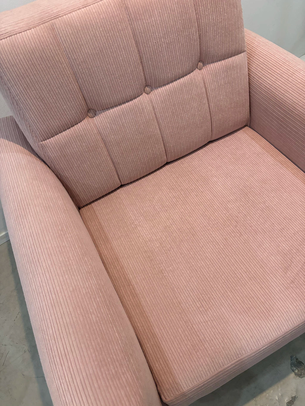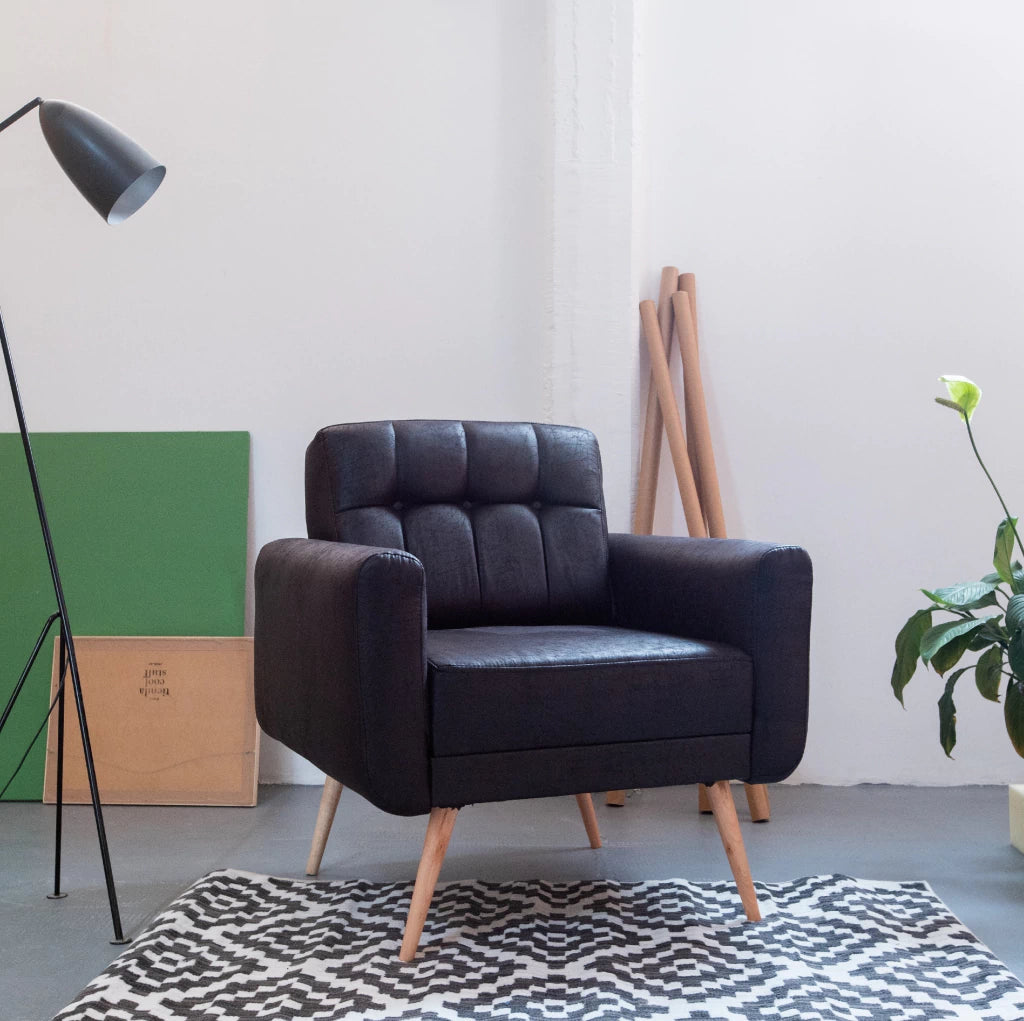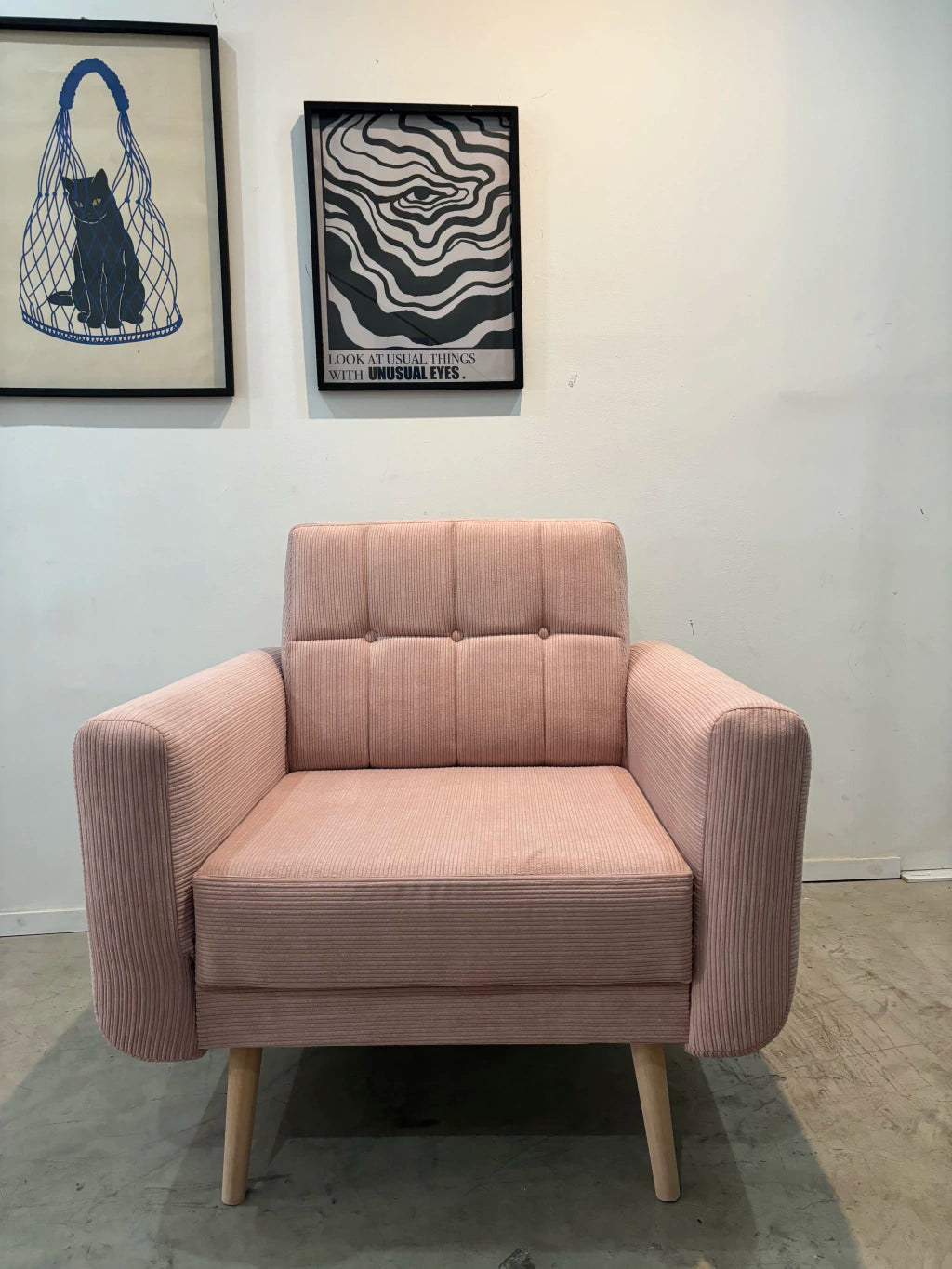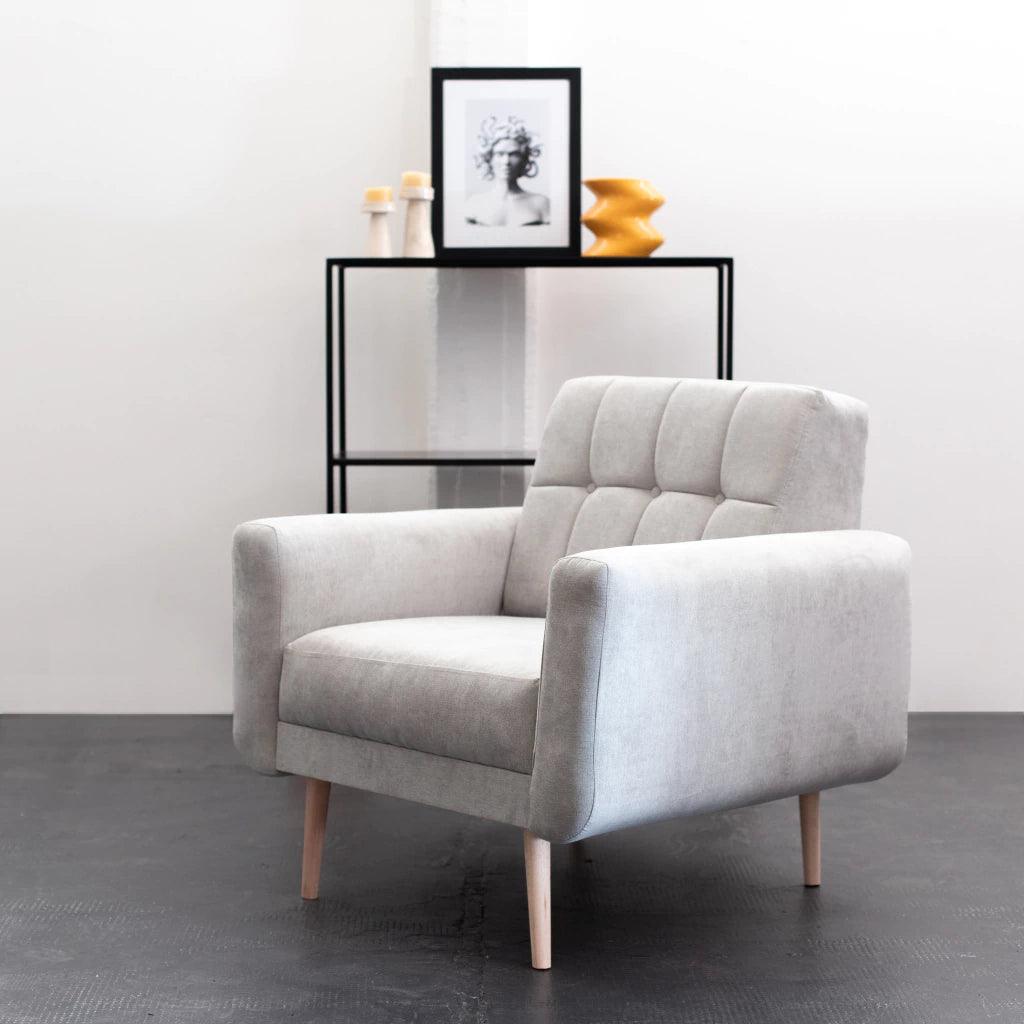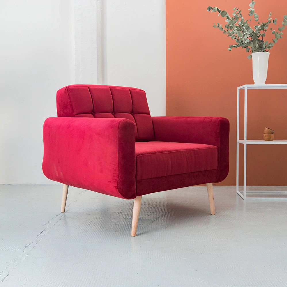 Es un sillón de 1 cuerpo, con un almohadón de asiento de placa de goma espuma de alta densidad integrado y un almohadón de respaldo integrado con capitoné que le da un estilo y diseño único. Tiene patas escandinavas. Tapizado con tela chenille de pelo corto anti desgarro o pana anti manchas. Consultar la opción de ecocuero.