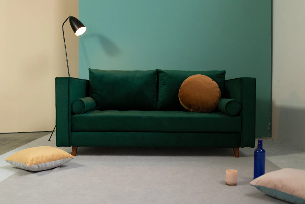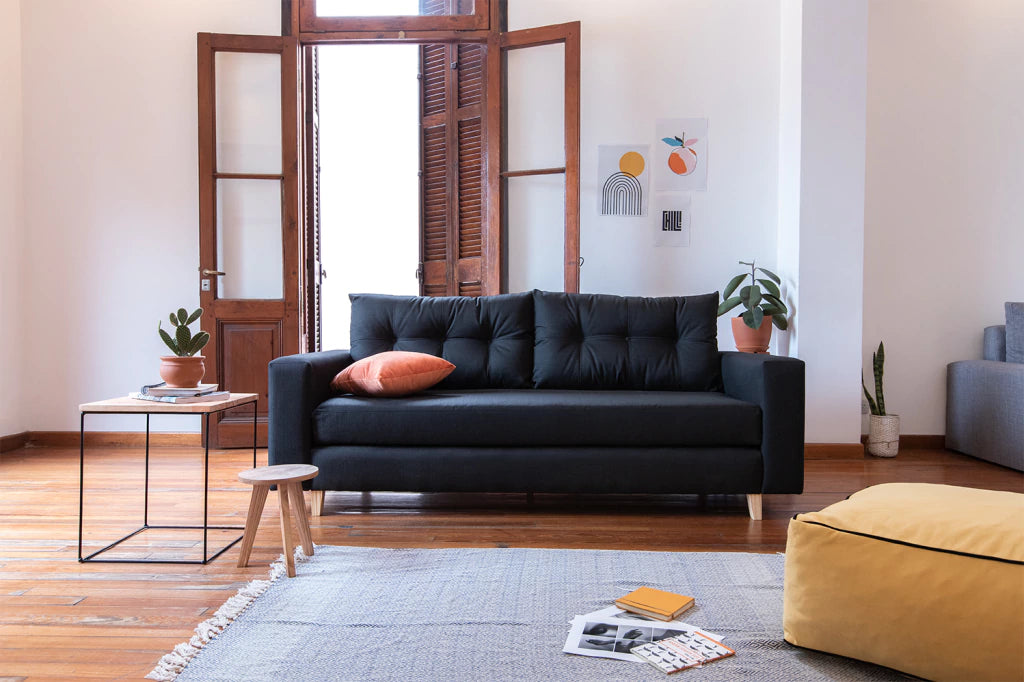 Es un sofá de 2 cuerpos con forma curva, con almohadón de asiento de placa de goma espuma de alta densidad y respaldo integrados, que le un estilo y diseño único. Tiene patas bajas de goma invisibles antideslizantes. Tapizado con tela chenille de pelo corto anti desgarro o pana anti manchas.