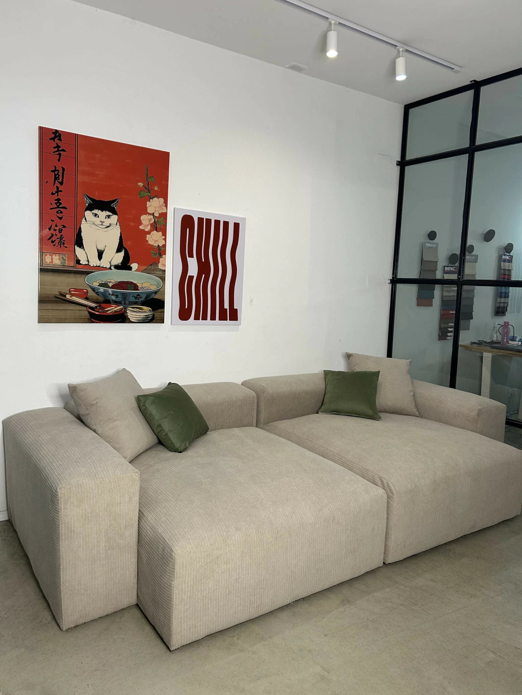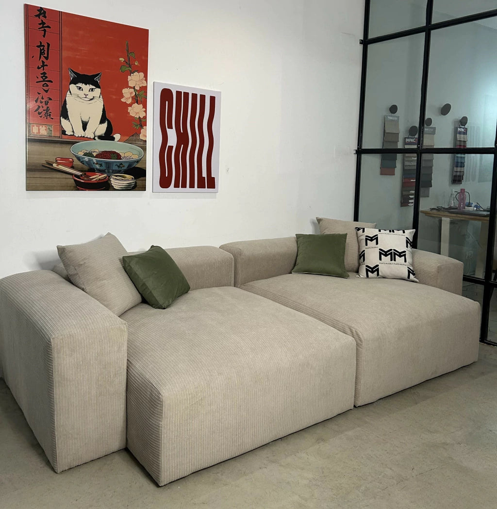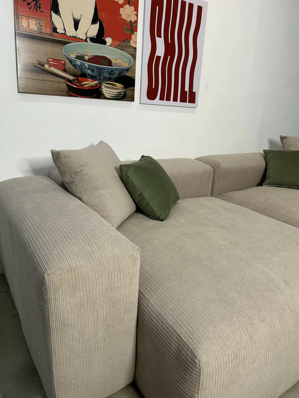 Es un sofá modular con estructura mayormente de goma espuma de alta densidad con almohadones integrados y apoyabrazos. La profundidad le brinda una mayor comodidad. Tiene patas bajas de goma anti deslizantes. Tapizado con tela pana Bahía anti manchas. Consultar la opción de chenille de pelo corto anti desgarro y otras panas.