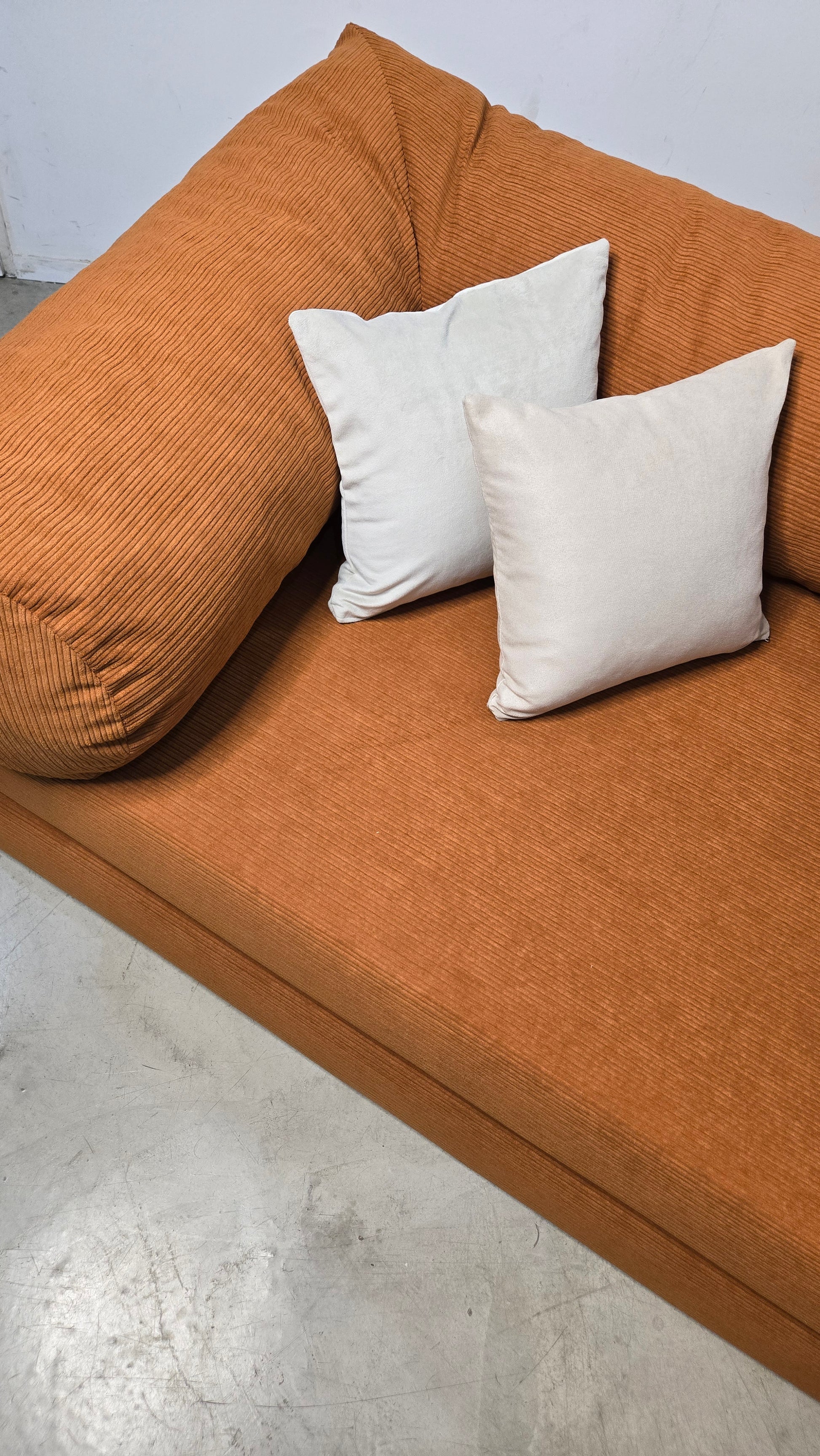 Es un sofá cama con doble placa de asiento de alta densidad de 25 kg soft, con almohadones de respaldo en forma de "L" rellenos con copos de goma espuma de alta densidad y guata, caños de hierro cromado. Tapizado con tela pana Bahía anti manchas. Consultar la opción de otras telas.